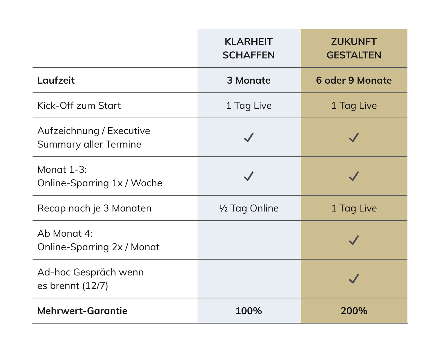 Lass uns im unverbindlichen Klarheitsgespräch herausfinden, welches Sparring-Format Deine individuelle Zielsetzung am Besten unterstützt: